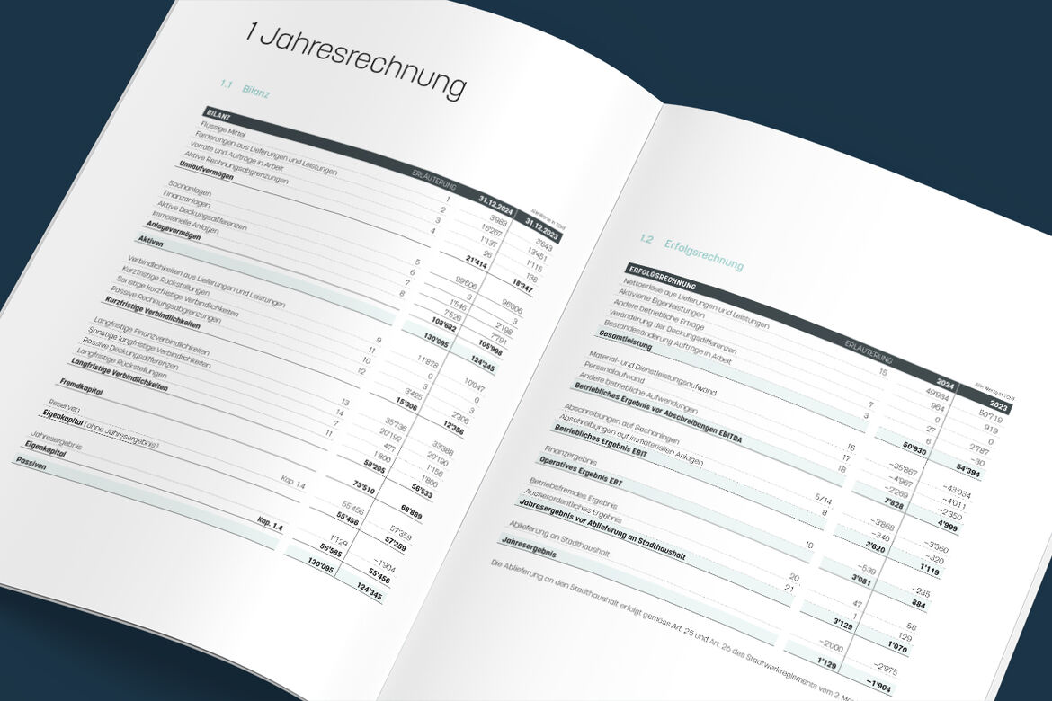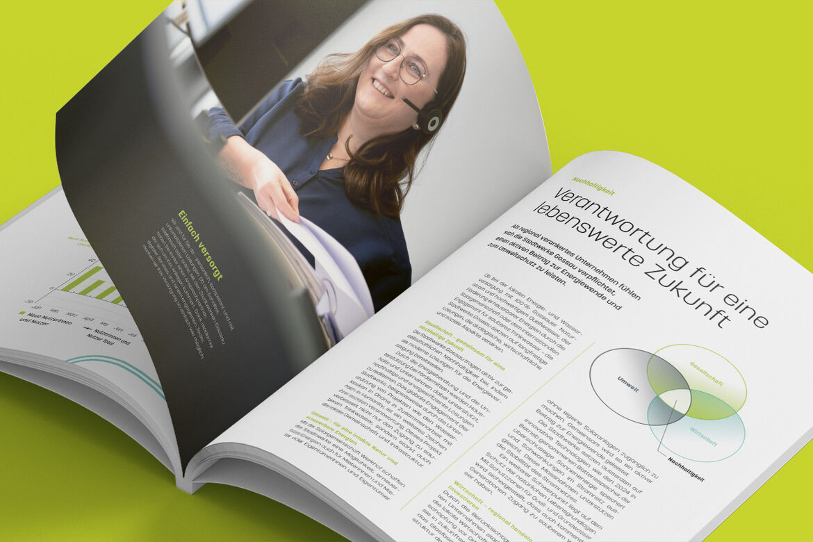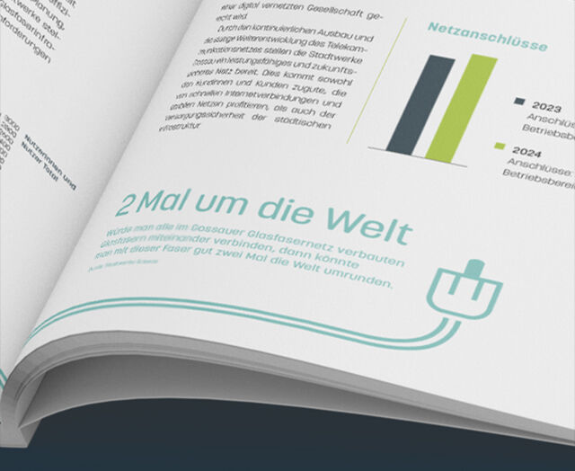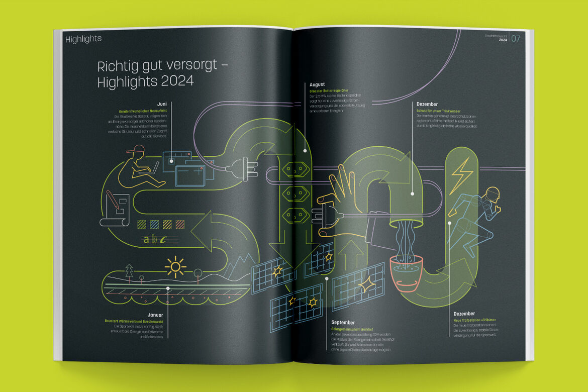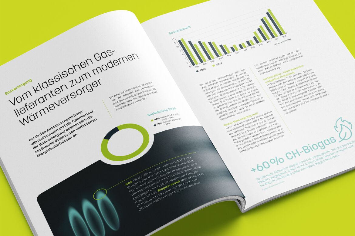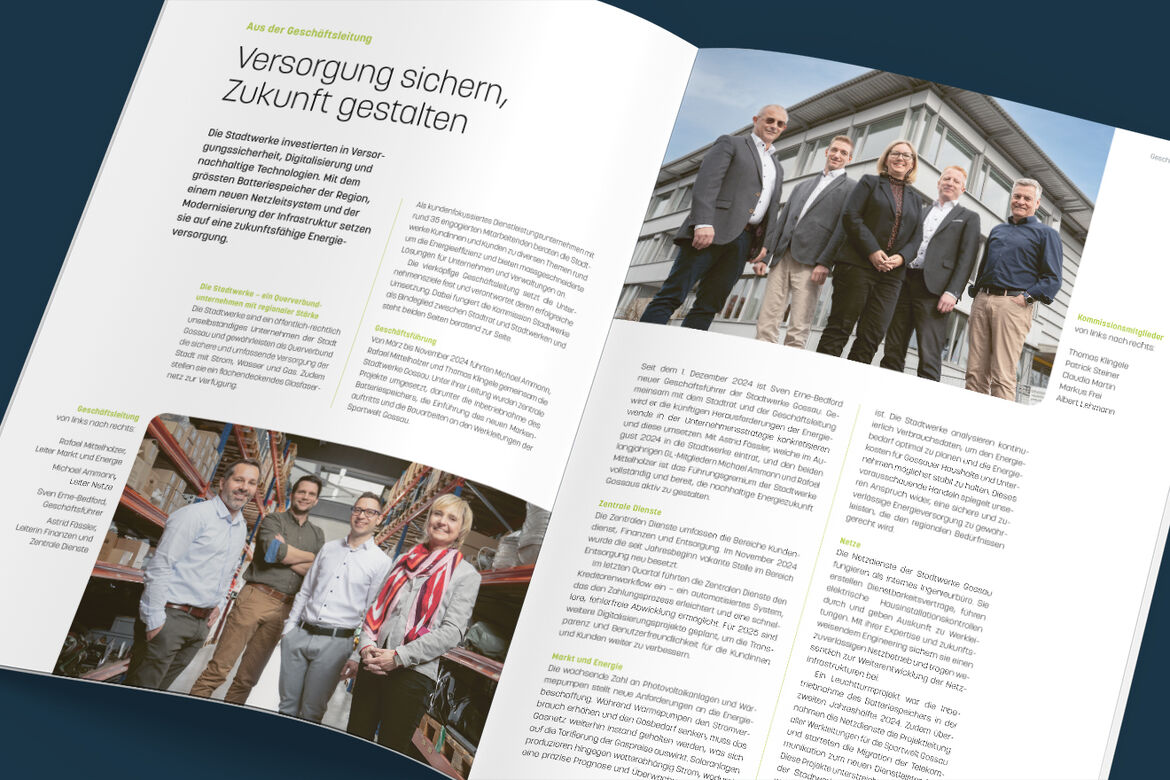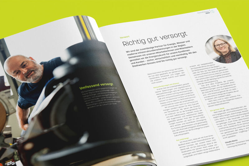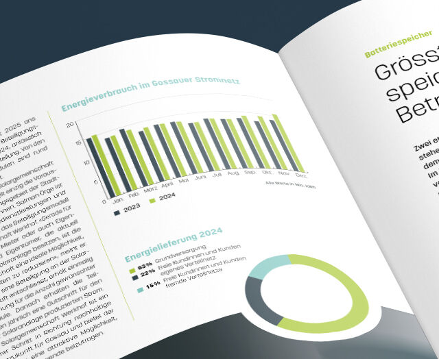 Ein Geschäftsbericht ist auch immer ein Spiegel dessen, wofür ein Unternehmen steht. Bei den Stadtwerken Gossau sind das: umfassende Versorgung, hohe Versorgungssicherheit und einfache, kundennahe Lösungen. Diese Werte bilden den inhaltlichen Rahmen und werden durch Gestaltung, Sprache und Bildwelt erlebbar.