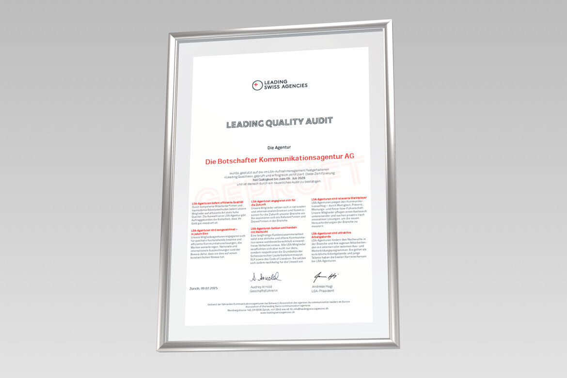 Die Botschafter Kommunikationsagentur AG wurde vom Verband Leading Swiss Agencies (LSA) mit voller Punktzahl rezertifiziert. Der LSA ist der Qualitätsverband für Kommunikationsagenturen in der Schweiz. Auftraggebende profitieren damit nachweislich von höchster Qualität, geprüften Prozessen und wirksamer Kommunikation.